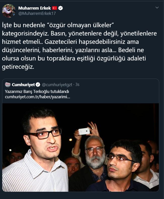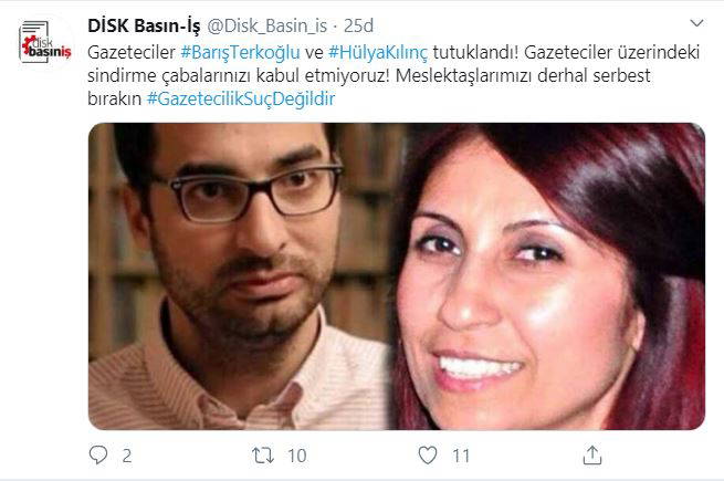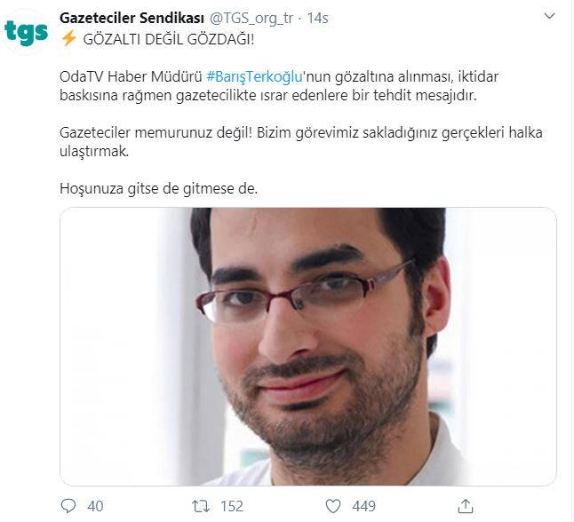 Gazetemiz yazarı ve Odatv Haber Müdürü Barış Terkoğlu ve gazeteci Hülya Kılınç dün sabah gözaltına alınmalarının ardından, çıkarıldıkları Nöbetçi Sulh Ceza Hakimliği'nce gece saatlerinde tutuklandılar. Barış Terkoğlu kararın ardından, "Bugün bir çetenin bizi susturma kararı yüzümüze okundu ama susmayacağız" dedi.