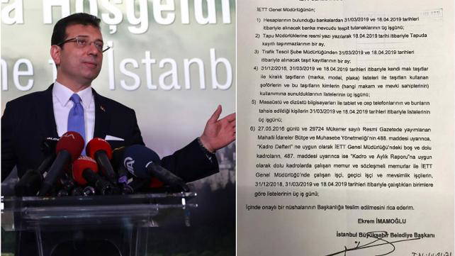 Seçim günü olan 31 Mart ile yazının gönderildiği 18 Nisan arasını kapsayacak şekilde banka mevcudu tespit tutanaklarını isteyen İmamoğlu, tapuda kayıtlı taşınmazları, belediyeye kayıtlı araçların listelerini, araçların kimler tarafından kullanıldığını, masaüstü ve dizüstü bilgisayarlar ile tablet ve cep telefonlarının ve bunların tahsis edildiği kişileri, memur, sözleşmeli memurların listelerini de istedi.