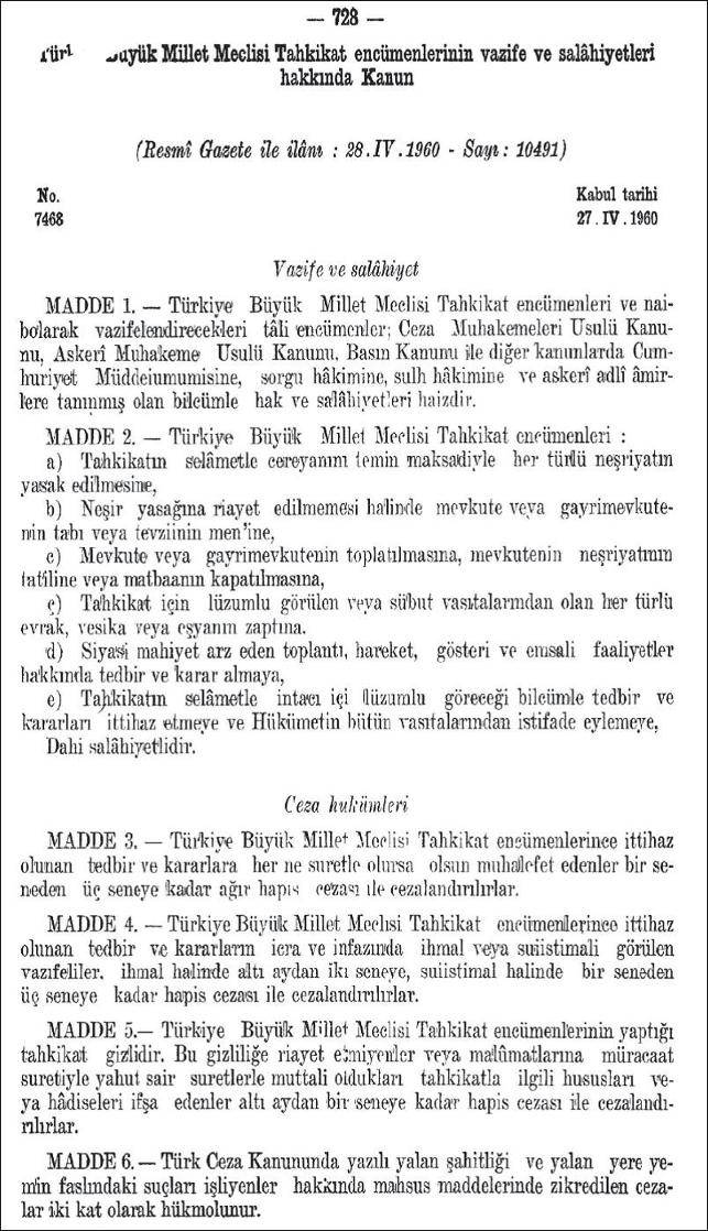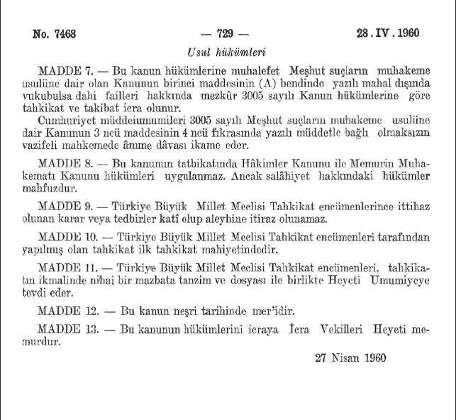 Görüldüğü gibi “Kanunun” birinci maddesi Demokrat Parti Milletvekillerinden kurulacak olan “Encümen”e, hem askeri hem sivil mahkemelerin, üstelik de hem savcı hem de yargıçların hak ve yetkilerini veriyordu.