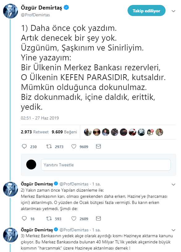 Bir Ülkenin Merkez Bankası rezervleri, O Ülkenin KEFEN PARASIDIR, kutsaldır. Mümkün olduğunca dokunulmaz. Biz dokunmadık, içine daldık, erittik, yedik.