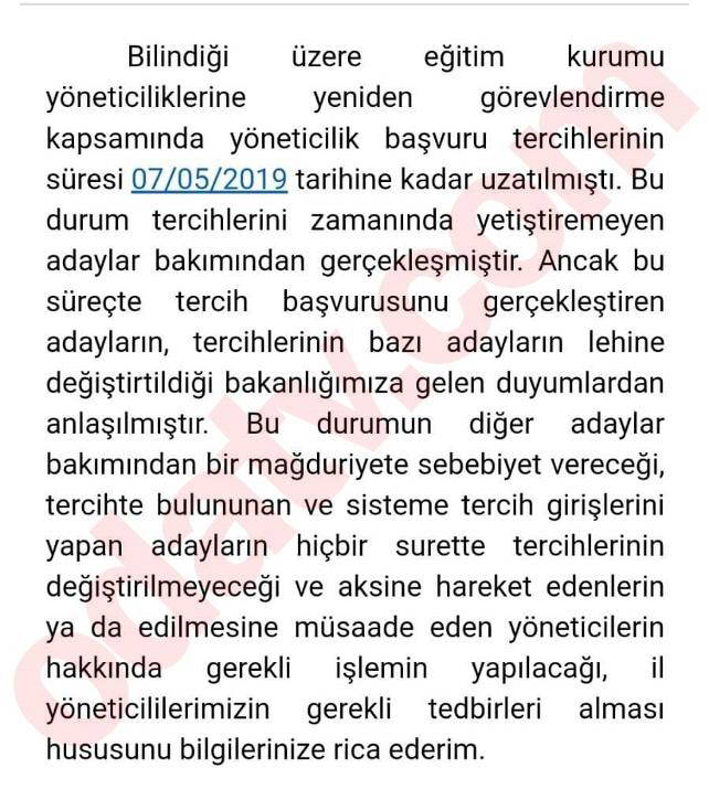 “Bilindiği üzere eğitim kurumu yöneticiliklerine yeniden görevlendirme kapsamında yöneticilik başvuru tercihlerinin süresi 07/05/2019 tarihine kadar uzatılmıştı. Bu durum tercihleri zamanında yetiştiremeyen adaylar bakımından gerçekleşmiştir. Ancak bu süreçte tercih başvurusunu gerçekleştiren adayların, tercihlerinin bazı adayların lehine değiştirtildiği bakanlığımıza gelen duyumlardan anlaşılmıştır. Bu durumun diğer adaylar bakımından bir mağduriyete sebebiyet vereceği, tercihte bulunan ve sisteme tercih girişlerini yapan adayların hiçbir surette tercihlerinin değiştirilmeyeceği ve aksine hareket edenlerin ya da edilmesine müsaade eden yöneticilerin hakkında gerekli işlemin yapılacağı, il yöneticililerimizin gerekli işlemin yapılacağı, il yöneticilerimizin gerekli tedbirleri alması hususunda bilgilerinizi rica ederim.”