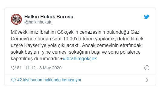 Gökçek’in naaşı hastane morgundan alınıp dün Gazi Cemevi’ne getirilmişti. Cenazesinin Kayseri’ye gönderilmesi öncesinde Gökçek için yürüyüş yapılmak istenmesi nedeniyle cemevinin etrafı polis tarafından çevrelendi. Cemevinin her iki girişine TOMA konumlandırılırken, çevredeki yollar polisler tarafından tutuldu.