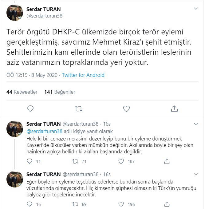 İbrahim Gökçek’in cenazesinin Kayseri’ye getirilmesi öncesi Kayseri Ülkü Ocakları Başkanı sosyal medyadan tehdit mesajı yayınladı. Kayseri Ülkü Ocakları Başkanı Serdar Turan, Gökçek’in cenazesinin Kayseri’ye getirilmesini ve cenaze töreni düzenlenmesini engelleyeceklerini öne sürerek “Eğer böyle bir eyleme teşebbüs ederlerse bundan sonra başları da vücutlarında olmayacaktır. Hiç kimsenin şüphesi olmasın ki Türk’ün yumruğu balyoz gibi tepelerine inecektir” ifadelerini kullandı.