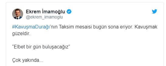?İstanbul Büyükşehir Belediye Başkanı Ekrem İmamoğlu da Twitter adresinden, "#KavuşmaDurağı'nın Taksim mesaisi bugün sona eriyor. Kavuşmak güzeldir. Elbet bir gün buluşacağız. Çok yakında..." ifadelerini kullandı.