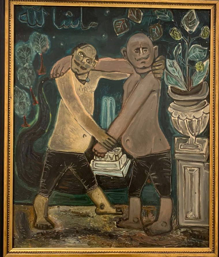 O da ne, iki pehlivan güreşe tutuşmuş, biri cin gözlerle seyirciye bakıyor öteki pek bir ciddi, Burak’ın resmindeki detaylar burada da var, arkada da bir fıskiyeli havuz. Ressam sanki çocukluğuna dönmüş ve böylesine naif böylesine etkileyici bir resim ortaya çıkmış. Dayanamayıp fotoğrafını çektim ve Taviloğlu’nun izin vereceğini tahmin ettiğim için işte köşemde yayımlıyorum. Gülümseyin.