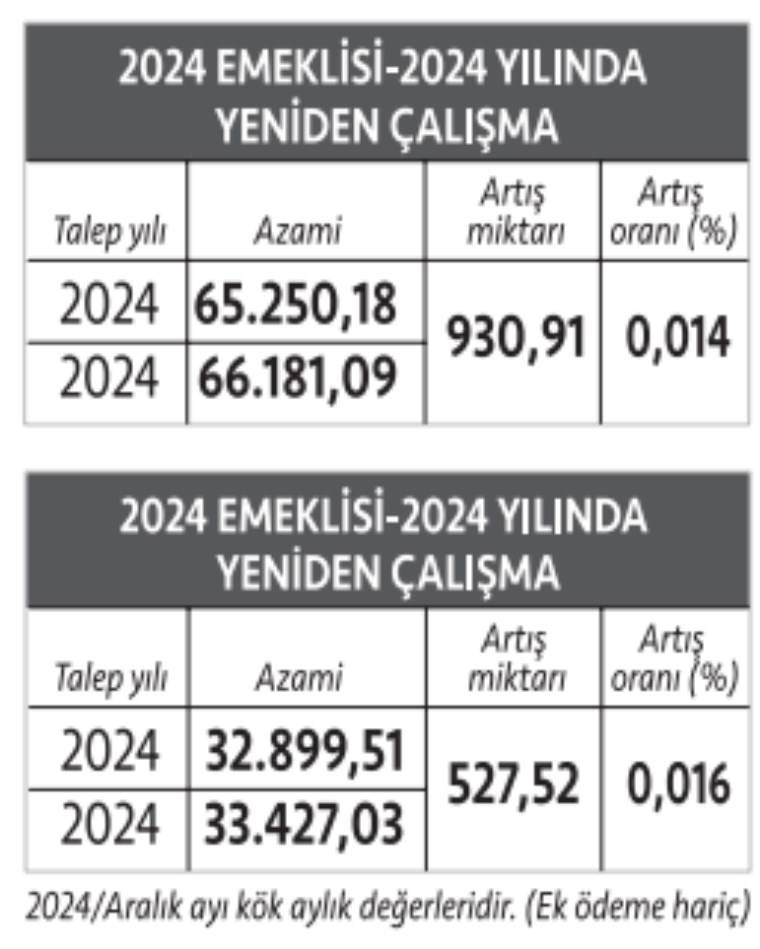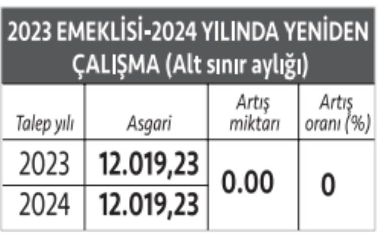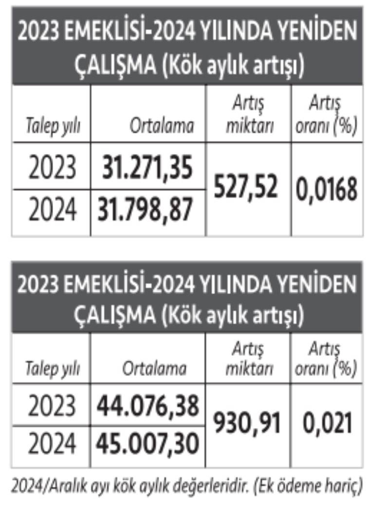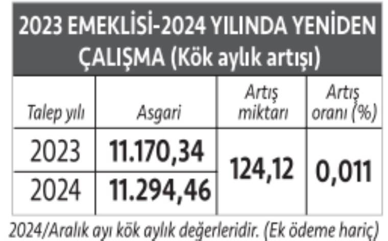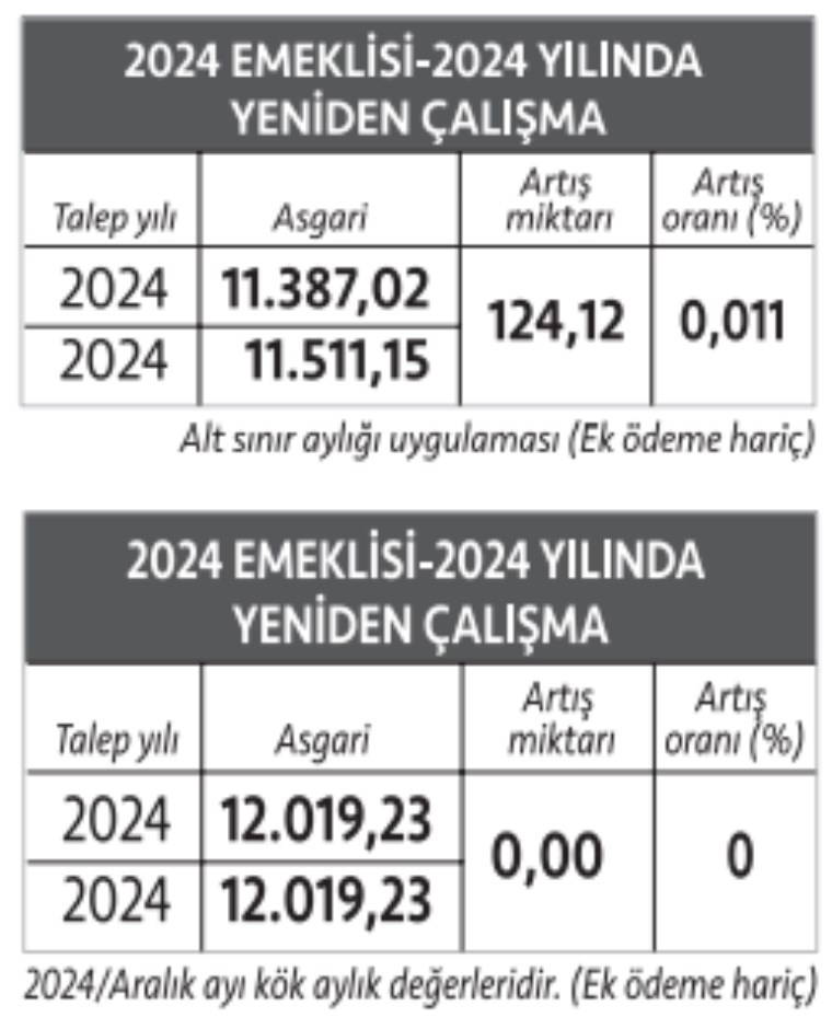 2023 yılında emekli olan kişi, 2024 yılında 2 ay asgari kazanç üzerinden çalışırsa, kök aylıktaki artış oranı yüzde 1.1 olmakla birlikte, kök aylık miktarı, ödenen aylık ek ödemesiz en düşük emekli aylığı olan (12.500 TL’nin ek ödemesiz tutarı) 12.019,23 TL’nin altında olduğundan, emeklinin eline geçen aylık miktarında herhangi bir değişiklik olmamaktadır.