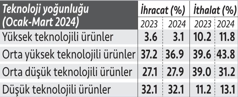 “TÜİK teknoloji yoğunluğuna göre dış ticaret verileri” imalat sanayimizin yapısını gösteren önemli bir göstergedir. 2024 Ocak-Mart döneminde yüksek teknoloji ürünlerinin imalat sanayi ürünleri ihracatı içindeki payı yüzde 3.1, ithalatı içindeki payı yüzde 11.8 oldu. 2023-2024 yılı karşılaştırmaları tabloda özetlenmiş.