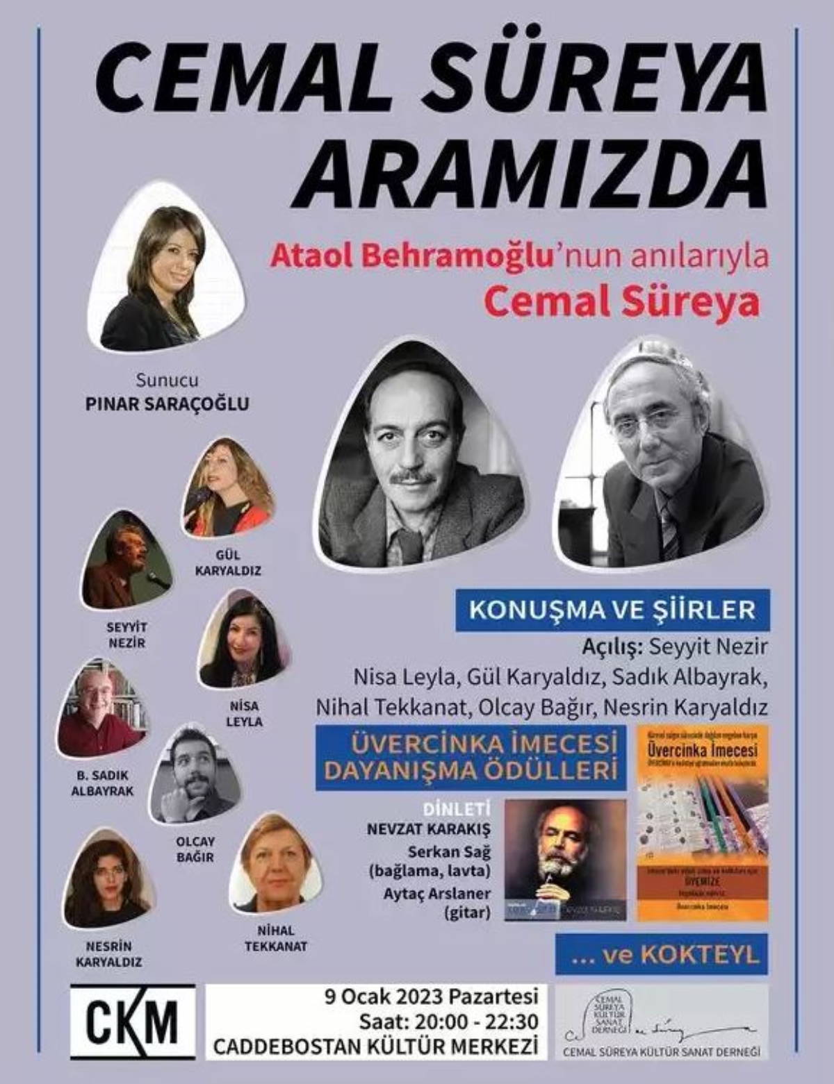 Cemal Süreya Kültür Sanat Derneği (CSKSD) ve Üvercinka dergisi, küresel salgın kısıtları nedeniyle dar alanlardaki buluşmalarla andığı Cemal Süreya’yı, 9 Ocak'ta (bugün), saat 20.00'da, Caddebostan Kültür Merkezi’nde düzenleyeceği “Çık gel bir kez daha yıkıntılardan” adlı etkinlikte anacak.