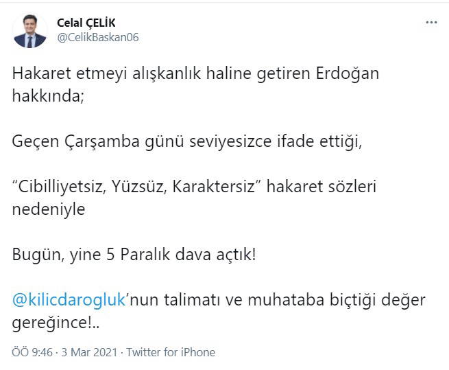 CHP Genel Başkanı Kemal Kılıçdaroğlu'nun avukatı Celal Çelik sosyal medya hesabı Twitter üzerinden yaptığı paylaşımla Cumhurbaşkanı Erdoğan hakkında hakaretleri nedeniyle '5 paralık' dava açtıklarını duyurdu.