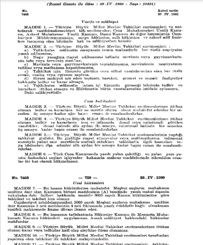 Demokrat Parti’nin bu sivil “Tahkikat Encümeni” darbesinin iyice anlaşılabilmesi için orijinal yasanın bazı maddelerini aynen aşağıya aldım: