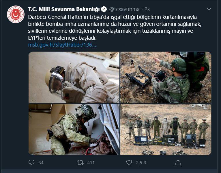 Sabah gazetesi haberi sosyal medyadan, “Türk Askeri Libya'da! Türk Silahlı Kuvvetleri’ne (TSK) bağlı unsurlar, Libya’da ilk kez görüntü verdi. Askerler, Hafter’e bağlı milislerin tuzakladığı el yapımı patlayıcı ve mayınların temizliğine başladı” ifadeleriyle paylaştı.