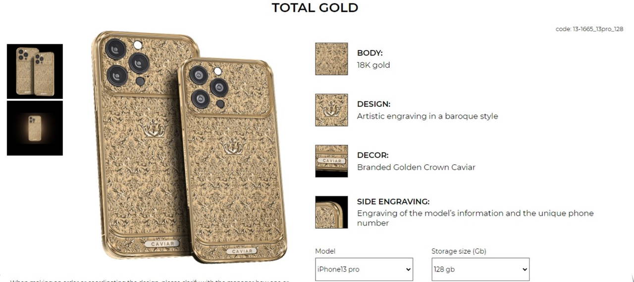 İngiliz mücevher firması Caviar'ın hazırladığı 'Total Gold' adlı özel seri, Apple'ın en yeni amiral gemisi akıllı telefonu iPhone 13 Pro ve iPhone 13 Pro Max'in 18 ayar altından yapılmış versiyonlarını içeriyor.