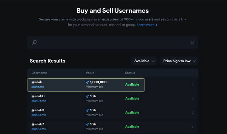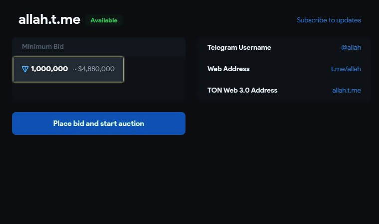 Sitede kullanıcı adları aratıldığında, Allah (.t.me) uzantılı profil adının, yaklaşık 4 milyon 880 bin dolar (yaklaşık 160 milyon TL) açılış fiyatı ile açık artırmaya sunulduğu; aynı şekilde, Hz. İsa'yı niteleyen 'Jesus' kullanıcı adının ise yaklaşık 500 bin dolardan açık artırmaya çıkarıldığı görüntülenebiliyor.