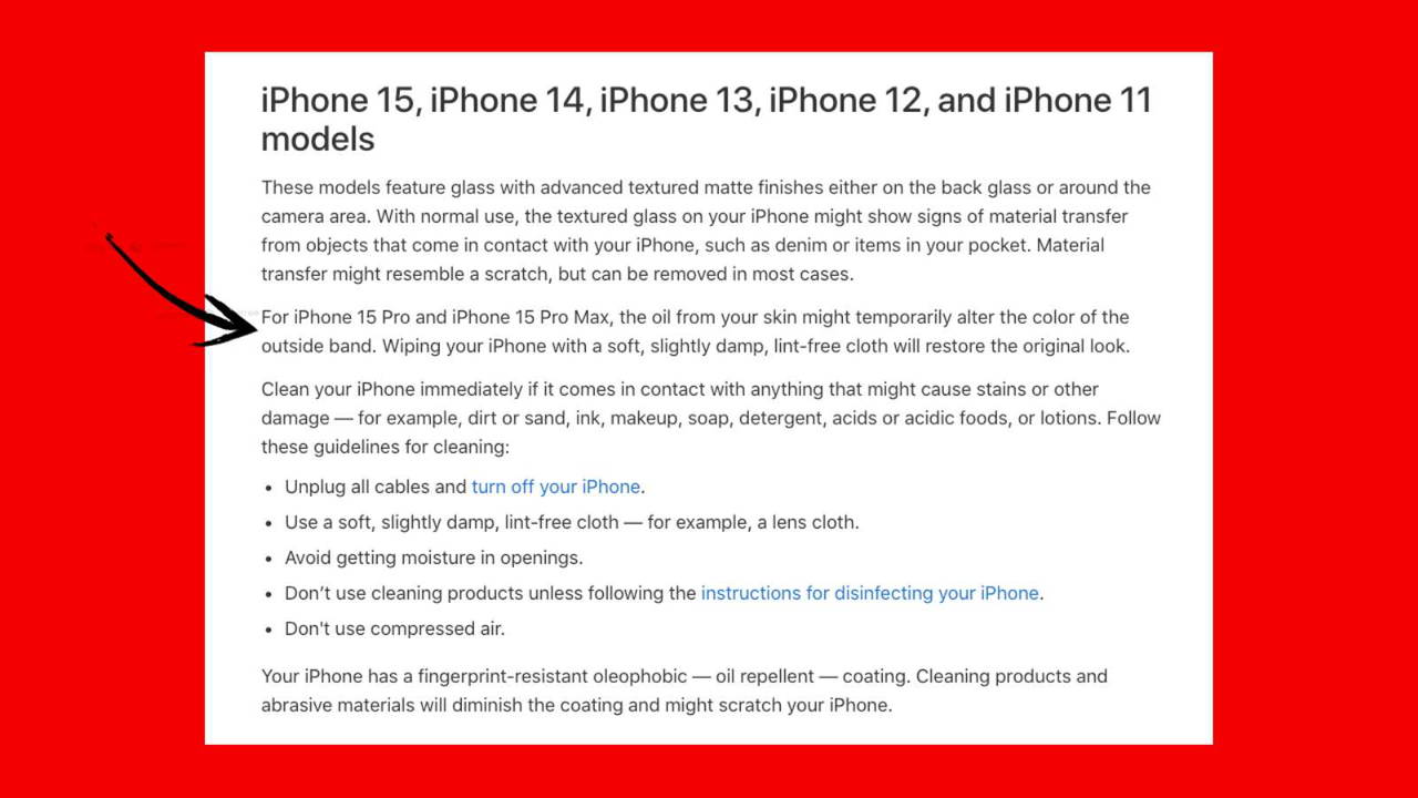 "iPhone 15 Pro ve iPhone 15 Pro Max için cildinizdeki yağ, dış bandın rengini geçici olarak değiştirebilir. iPhone'unuzu yumuşak, hafif nemli, tüy bırakmayan bir bezle silmek orijinal görünümünü geri kazandıracaktır."