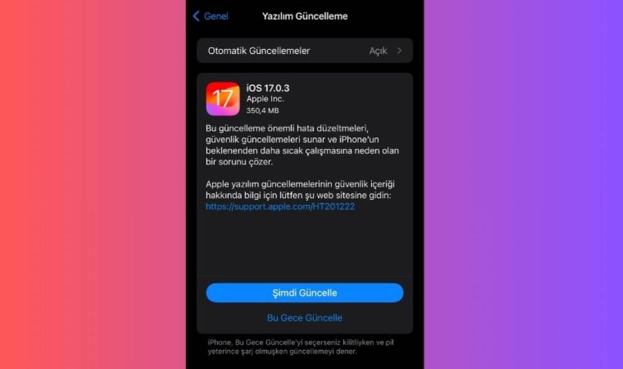 Yeni iPhone 15'leriyle beraber iOS 17'yi de sunan Apple, aşırı ısınma sorunlarıyla gündeme gelmeye başladı. Bu sorunu kabul eden Apple, yaşanan ısınma sorununun yazılımsal olduğunu söyleyerek güncelleme ile çözeceğini aktardı. Açıklamanın ardından güncellemeyi sunan Apple, iOS 17.0.3 ile 'ısınma sorununu ve bazı güvenlik sorunlarını' çözmeyi vadediyor.