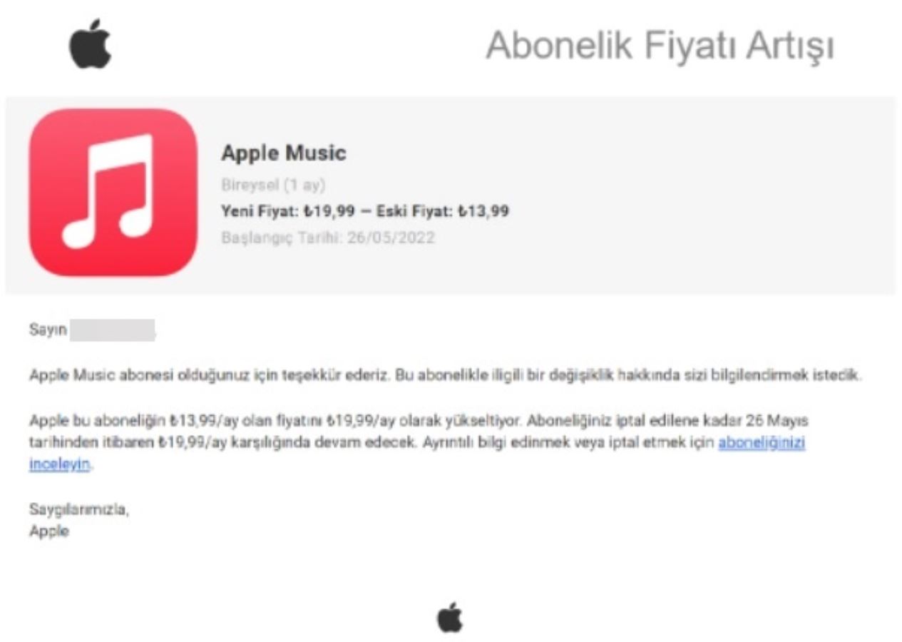 "Sayın Müşterimiz, Apple Music abonesi olduğunuz için teşekkür ederiz. Bu abonelikle ilgili bir değişiklik hakkında sizi bilgilendirmek istedik.