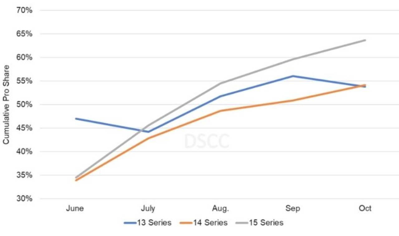 Haziran ve Ekim dönemine bakıldığında iPhone 15 Pro, yüzde 64 oranında bir paya sahip. iPhone 13 Pro ve iPhone 14 Pro modelleri ise yüzde 54 civarında bir paya sahip olarak karşımıza çıkıyor.