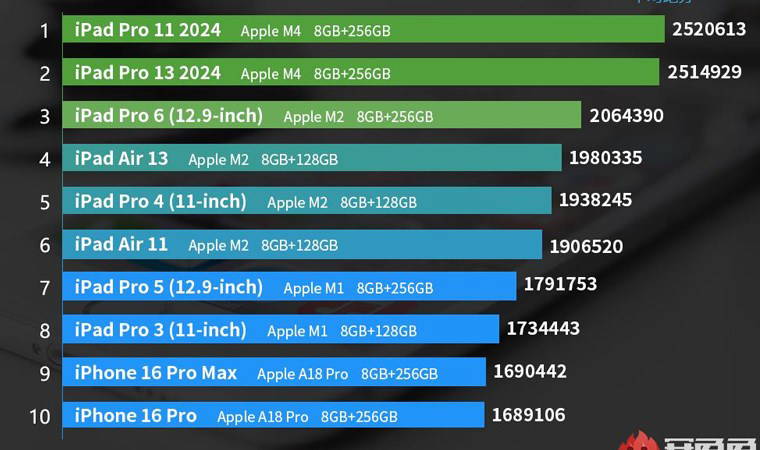Apple’ın performans açısından en güçlü ürünü, 2 milyon 520 bin 613 puan ile M4 çipli iPad Pro 11 (2024) oldu. Bu güçlü cihazı 2 milyon 514 bin 929 puanla yine M4 çipli 13 inç iPad Pro (2024) takip ediyor. Listenin üçüncü sırasında ise, M2 çipli 12.6 inç iPad Pro 6 yer alırken, dördüncü sırada yine M2 çipine sahip iPad Air 13 karşımıza çıkıyor.