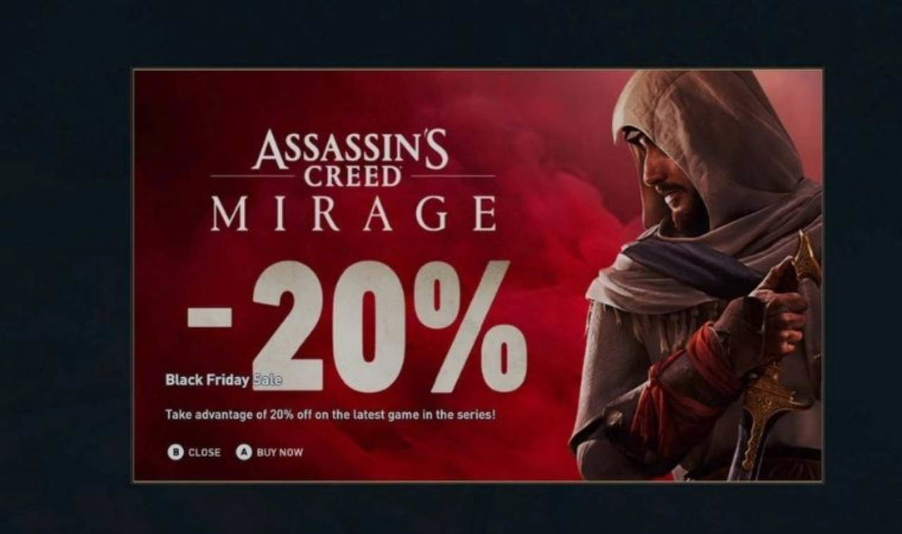 Burada oyuncunun karşısına çıkan reklam yine Assassin's Creed oyunu oldu. Black Friday kapsamında Assassin's Creed Mirage'ın yüzde 20 indirim yapıldığı reklam olarak çıktı.
