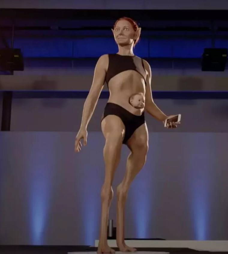 Ayrıca, 'kan dolaşımını iyileştirmek' için modelin uyluklarında 'küçük pompalar' ve 'göğüs altında köpek kalbi ve kuğu akciğerleri' var.