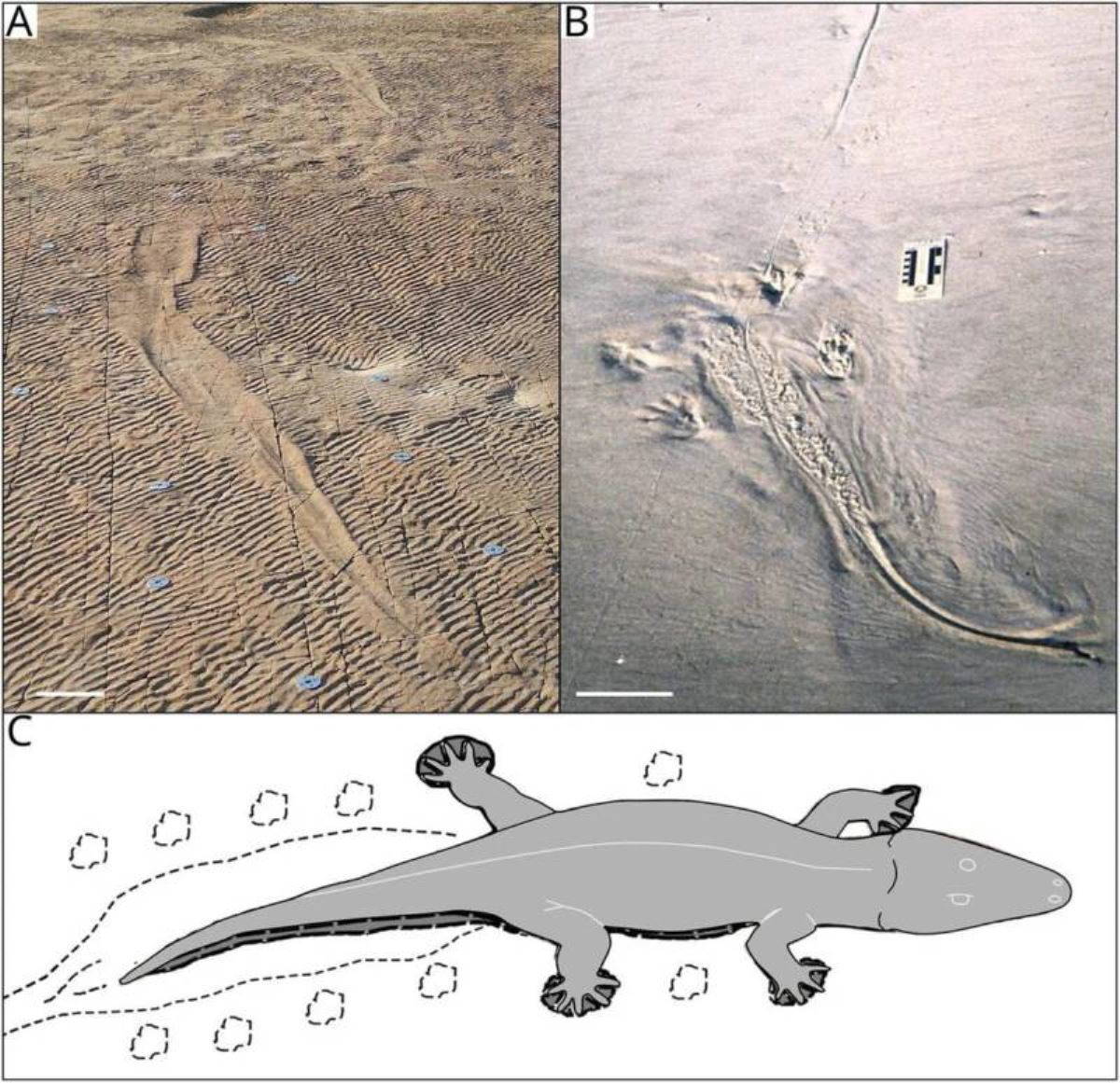 Bilim insanları, dronlar ve 3D tarayıcılar gibi modern teknolojileri kullandı ve yaklaşık 255 milyon yıl önce timsah benzeri rhinesuchid temnospondyl'in bıraktığı ayak izlerini tespit edebildiler.