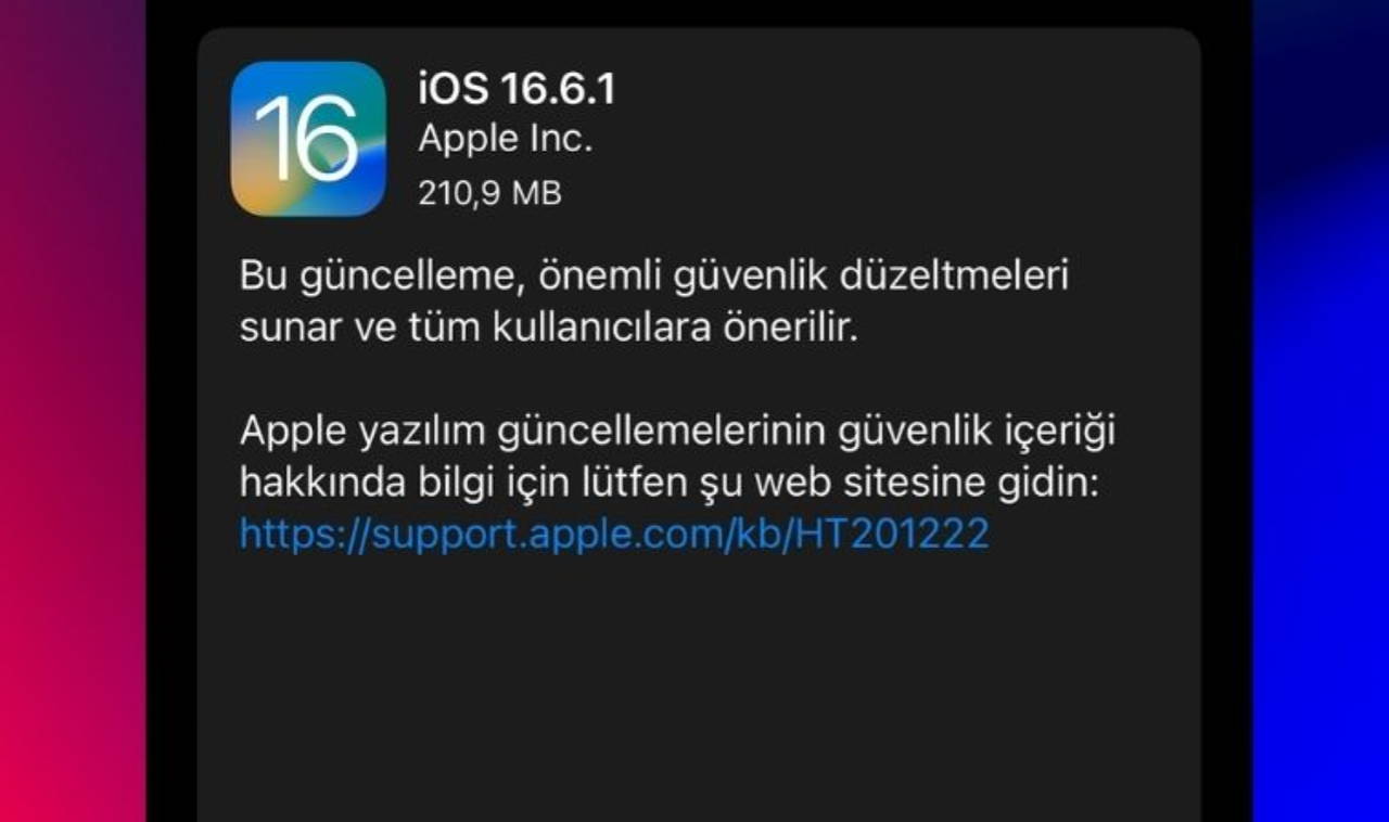Apple, iOS 17'yi tanıtmaya hazırlanıyor. Birkaç gün içinde tanıtılacak olan yeni iPhone'lar ve iOS 17 öncesinde iOS 16.6.1 sunuldu. iPhone sahipleri için 'bu güncelleme önemli güvenlik düzeltmeleri sunuyor ve bütün kullanıcılara indirilmesi' öneriliyor.