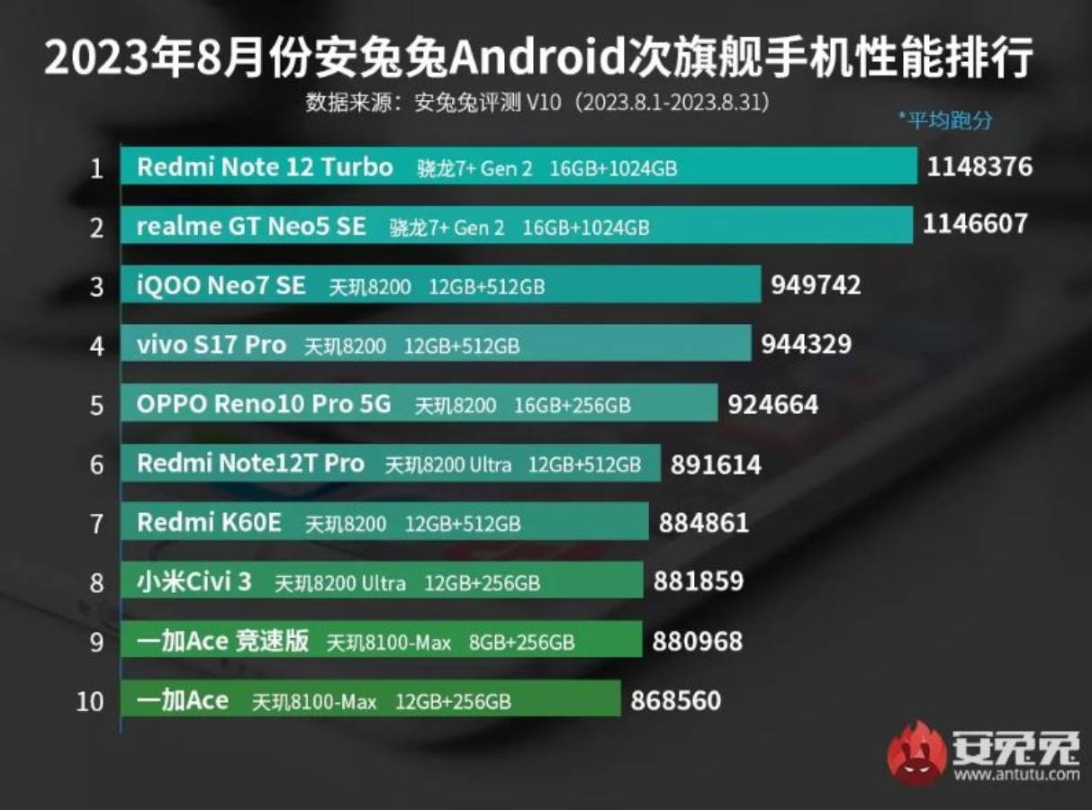 Her ay güncellenen listede Ağustos ayının en hızlı telefonu OnePlus Ace 2 Pro oldu. İkinci sırada ise Vivo'nun alt markası olan iQOO 11S yer aldı. Üçüncü sırada ise Nubia REDMAGIC 8S Pro+ yer aldı. Bu üç cihazın da Türkiye'de satışı bulunmuyor. Ancak Nubia REDMAGIC 8S Pro+'ın Türkiye'de satışa çıkacağına dair iddialar bulunuyor.