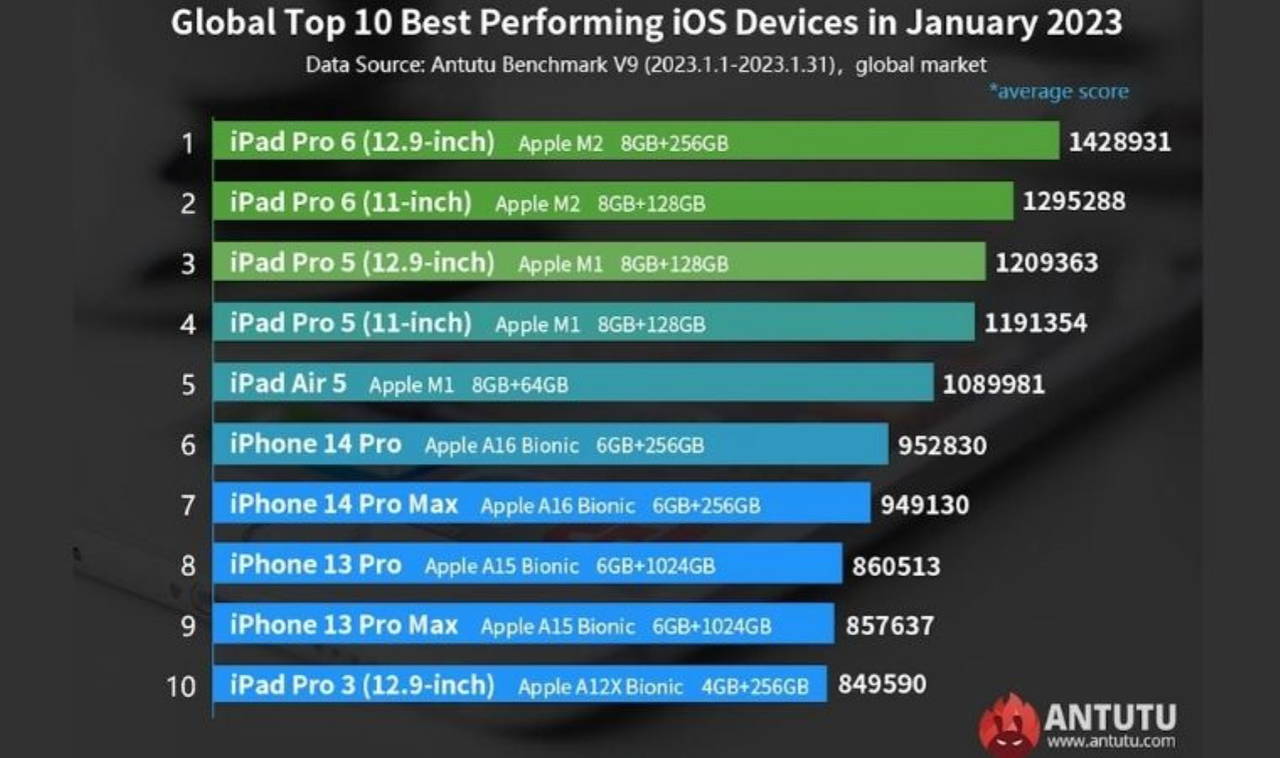 Apple'ın yeni tanıttığı cihazların yanında 'daha eski' modellere sahip iPad ve iPhone'lar da söz konusu listede yer alıyor. Yapılan testler sonucu Apple'ın en hızlı cihazlarını listeleyen AnTuTu, yeni sıralamayı paylaştı.