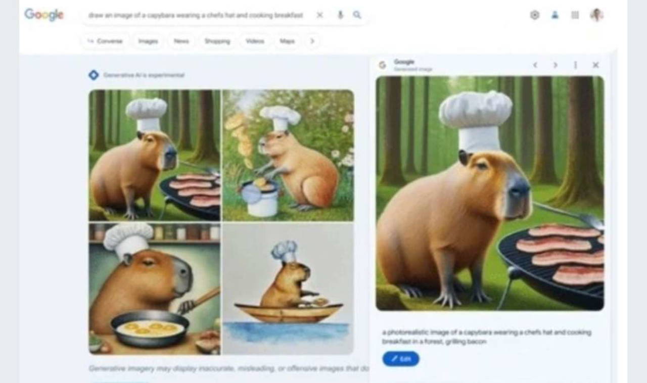 Google tarafından bir örnekle açıklandığı gibi, “Şef şapkası giyen ve kahvaltı hazırlayan bir kapibara resmi çiz.” yazıldığı zaman şu görsel oluşturuluyor;