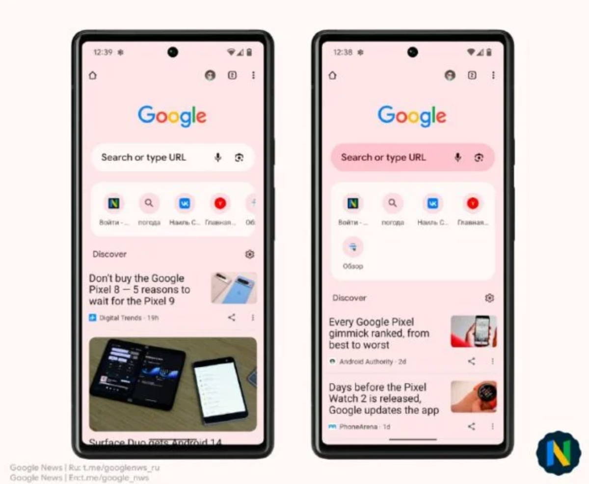 Yeniden tasarlanmış Yeni Sekme sayfası, büyük bir arama çubuğuna sahip. En çok ziyaret edilen web sayfalarını yuvarlak köşeli kutularda sıralayarak daha temiz bir görünüm sunuyor. Bu sayfaların arka planları, kullanıcının arka plan rengine uyum sağlayacak şekilde dinamik renklere sahip olacak. Şu anda Google, beyaz veya dinamik renkli bir arama çubuğunu test ediyor ve kullanıcılar aynı zamanda iki sıra sayfa etiketi veya tek satırlık bir karusel bulabilecekler.