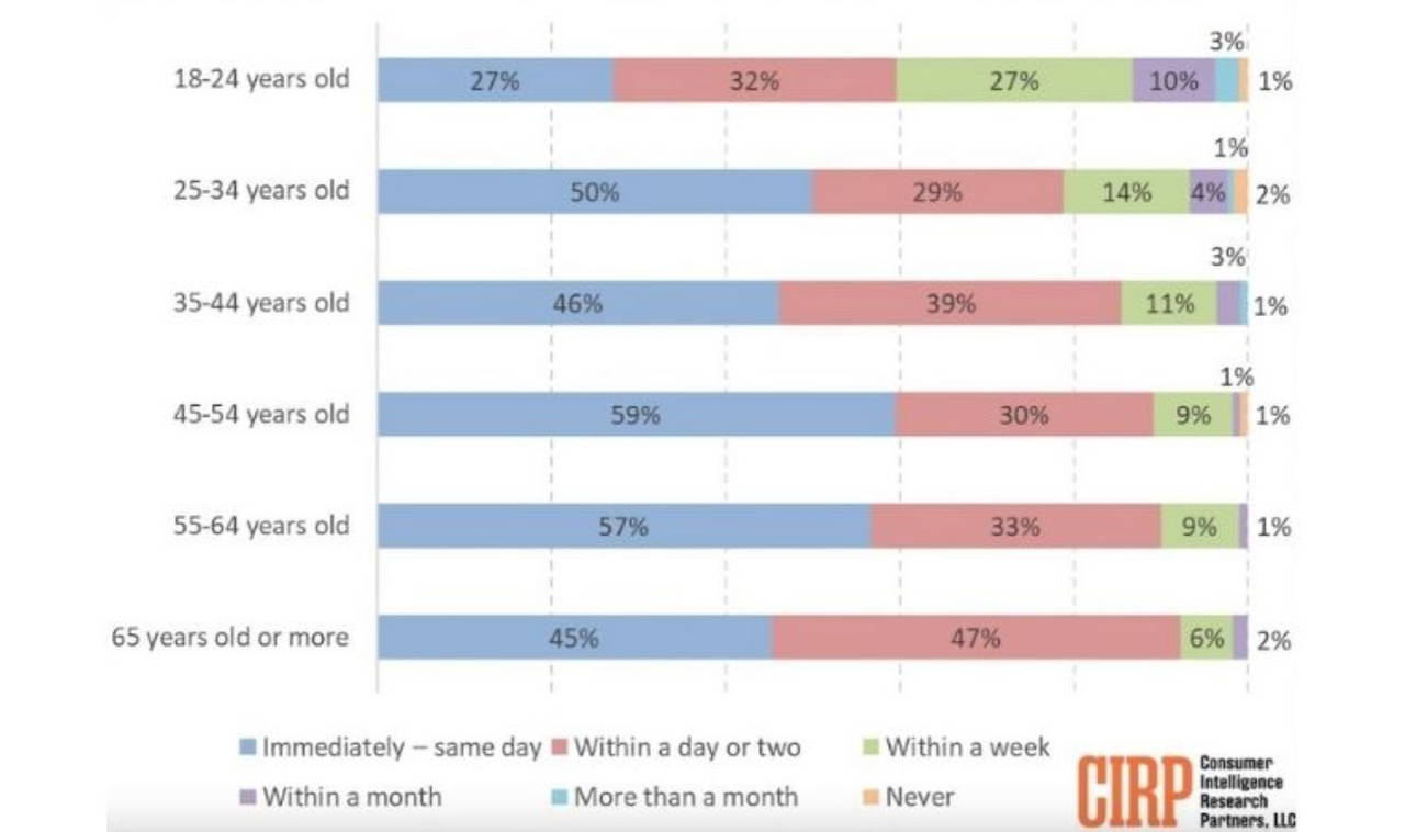 Tüketiciler hakkında araştırmalar yapan ABD merkezli Consumer Intelligence Research Partners (CIRP), geçtiğimiz hafta insanların Apple cihazlarını ne kadar hızlı değiştirdiği veya tamir ettirdikleri hakkında bir rapor yayınlamıştı. Raporda, ankete katılanların yüzde 80’inden fazlasının kaybolan, çalınan veya bozulan iPhone’larının hemen veya birkaç gün içerisinde yenisini alacağı veya tamir ettireceği, yalnızca yüzde 6’sının bir haftadan fazla bekleyeceği görülmüştü.