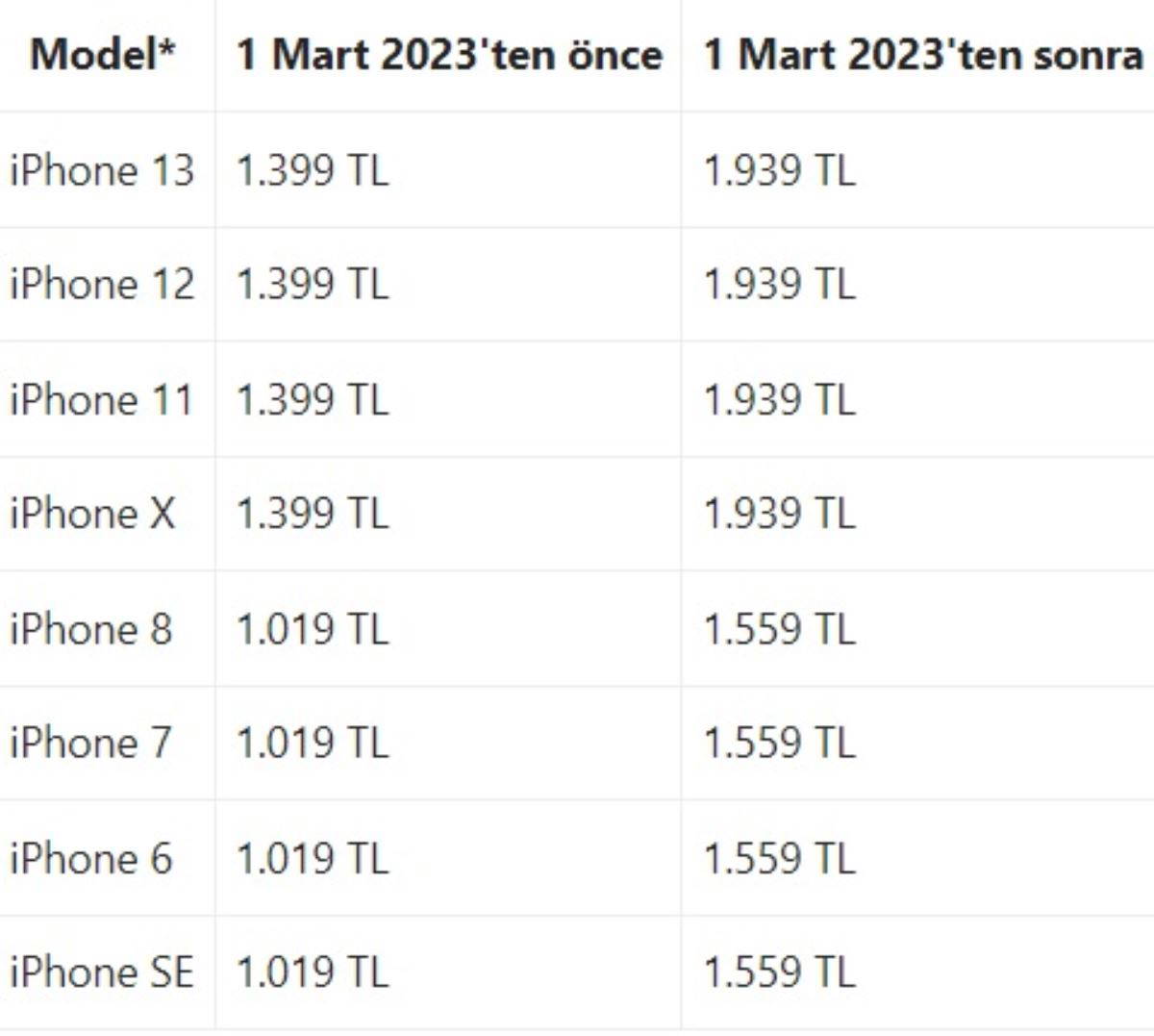 "Şu anda geçerli olan garanti kapsamı dışında pil servisi ücreti Şubat 2023'ün sonuna kadar geçerli olmaya devam edecektir. 1 Mart 2023 tarihinden itibaren geçerli olmak üzere, garanti kapsamı dışında pil servisi ücreti iPhone 14'ten önceki tüm iPhone modelleri için 540 TL tutarında artırılacaktır."