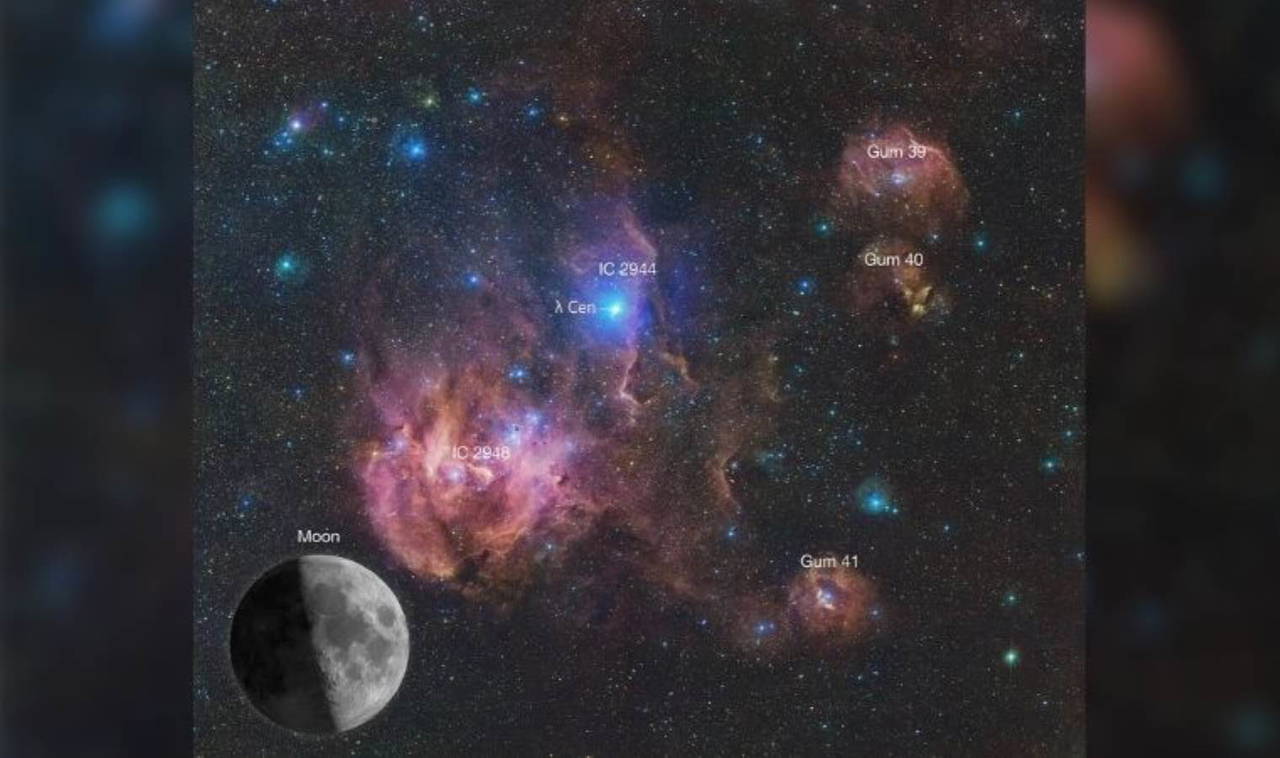 Farklı bölgeleri bir araya getiren bu görselde en parlak kısım IC 2948. Daha dikey bir yapıya sahip IC 2944 de dikkat çekiyor. Görselde aynı zamanda bulutsular dışında Lambda Centauri yıldızı da yer alıyor.