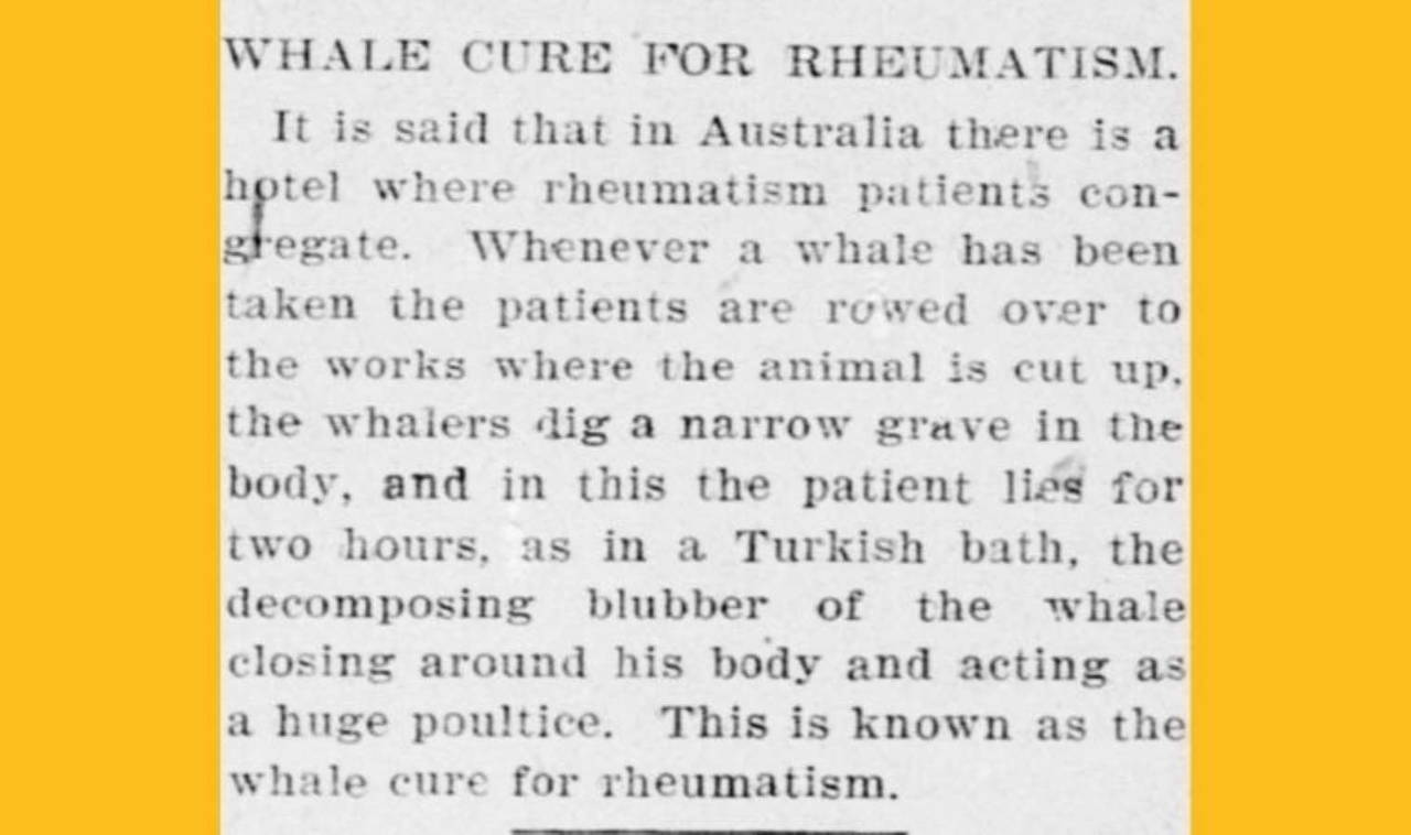 Avustralya'da 19. yüzyılın sonunda bir otelde romatoid artrit (eklem romatizması) hastaları ölü bir balinanın içine kondu. Hastaların birkaç saat leşin içinde yatmaları istendi.