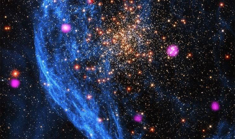 Bu görüntü ikili bir yıldız kümesini, mavi tonlu bir bulutu ve birkaç mor neon noktayı gösteriyor. Bu ikili küme, Samanyolu’na eşlik eden bir galaksi olan Büyük Macellan Bulutu’nun parçası olarak biliniyor. Daha büyük kümedeki parlak, altın renkli yıldızlar, görüntünün üst orta kısmını dolduruyor. Diğer küme ise çok daha ufak olup biraz yukarıda ve orta sağ kısma yakın duran mor neon halkalardan biriyle örtüşüyor. Bu ve diğer mor halkalar, Chandra’nın tespit ettiği X-ışını kaynaklarından bize ulaşıyor. Birleşik kümenin soluna doğru ise mavi tonlu dikey bir bulut çizgisi görünüyor.