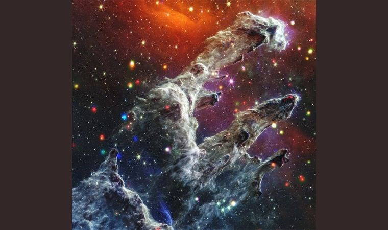 NASA'nın sitesinde yer alan açıklamaya göre bu bileşik görüntü, Yaratılış Sütunları olarak bilinen bir yıldız oluşum bölgesini gösteriyor. Görüntünün en altından çıkan uzun, gri renkli gaz ve toz sütunları sağ üste doğru uzanıyor. Arkasında koyu turuncu ve pembe renkli bir sis yer alan bulutsu gri sütunları beyaz, kırmızı, mavi, sarı ve mor renklerde parlayan, çok sayıda yumuşak nokta çevreliyor. Bu noktalar, X-ışını ve kızılötesi ışın yayan genç yıldızlar.