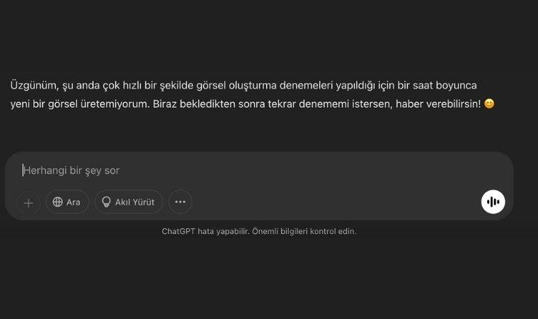 Özellik aslında aktif olarak kullanılabiliyor ancak çok fazla kişi bu özelliği kullanmaya çalıştığı için artık verilen komutlara karşılık olarak ChatGPT görselleri yapmayarak şu yanıtı vermeye başladı: