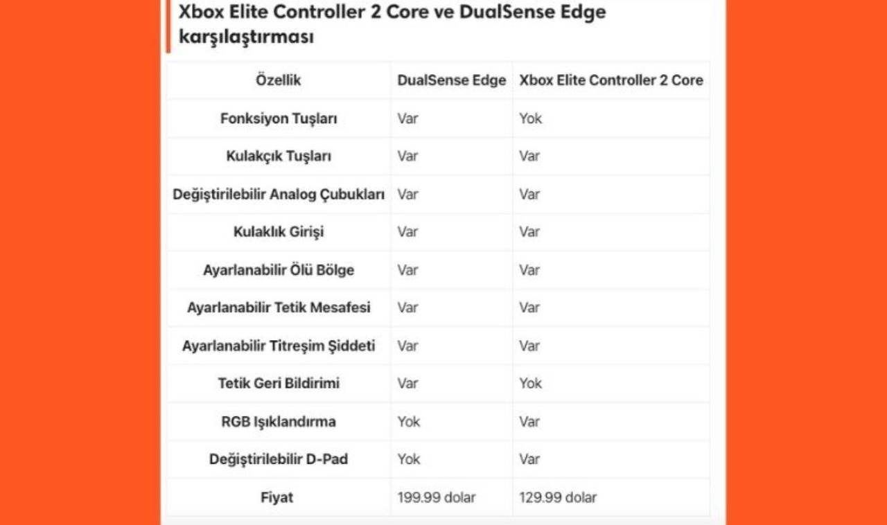 Pek çok özelleştirme sunan DualSense Edge kontrolcüsü, aslında sunduğu özellikler ile Xbox’ın tanıttığı Elite Controller’a oldukça benziyor. İşte özellik karşılaştırması:
