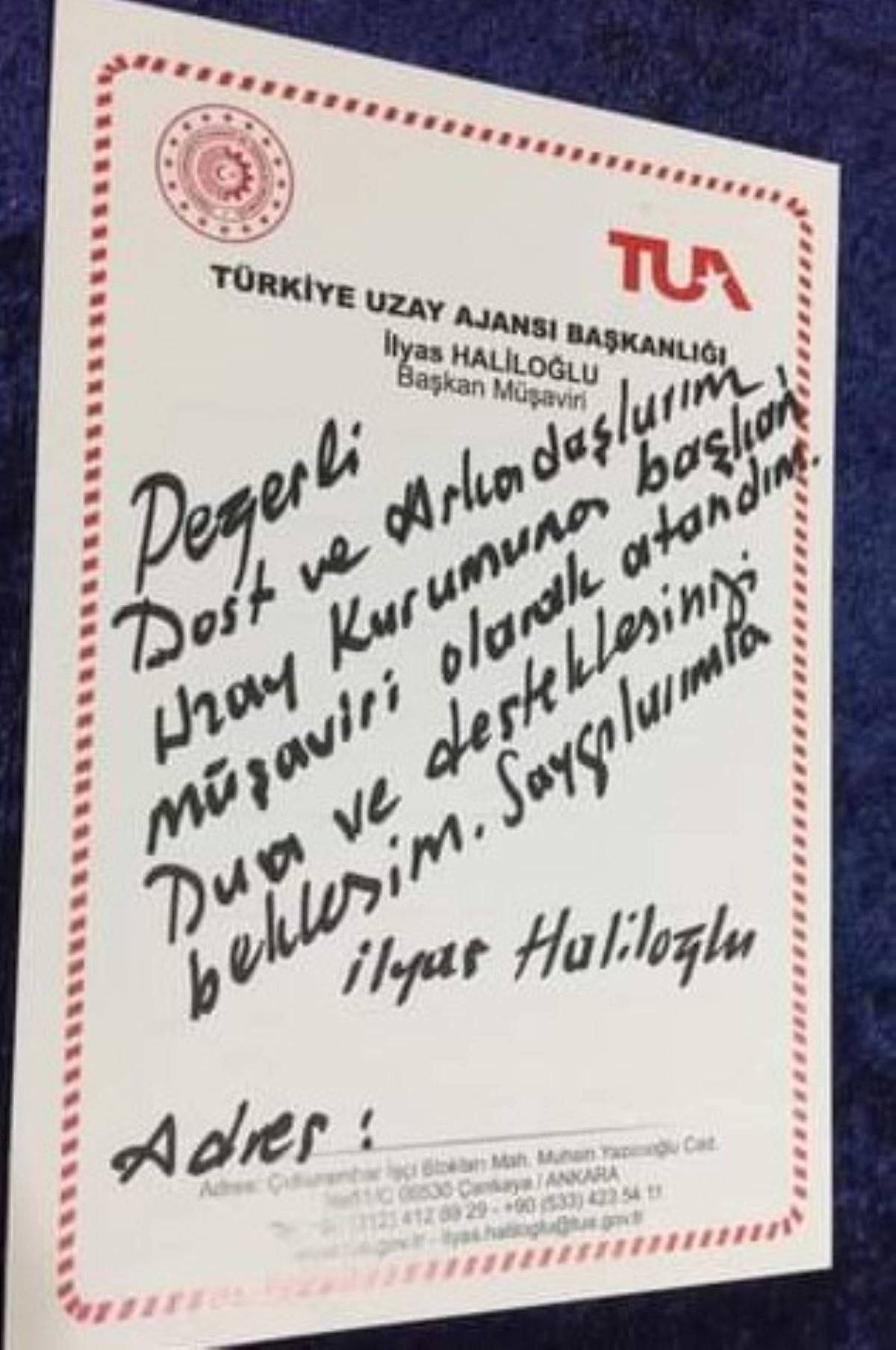 "Değerli dost ve arkadaşlarım; Türkiye Uzay Ajansı Kurumuna, Başkan Müşaviri olarak atandım. Dua ve desteklerinizi her zaman beklerim. Saygılarımla"