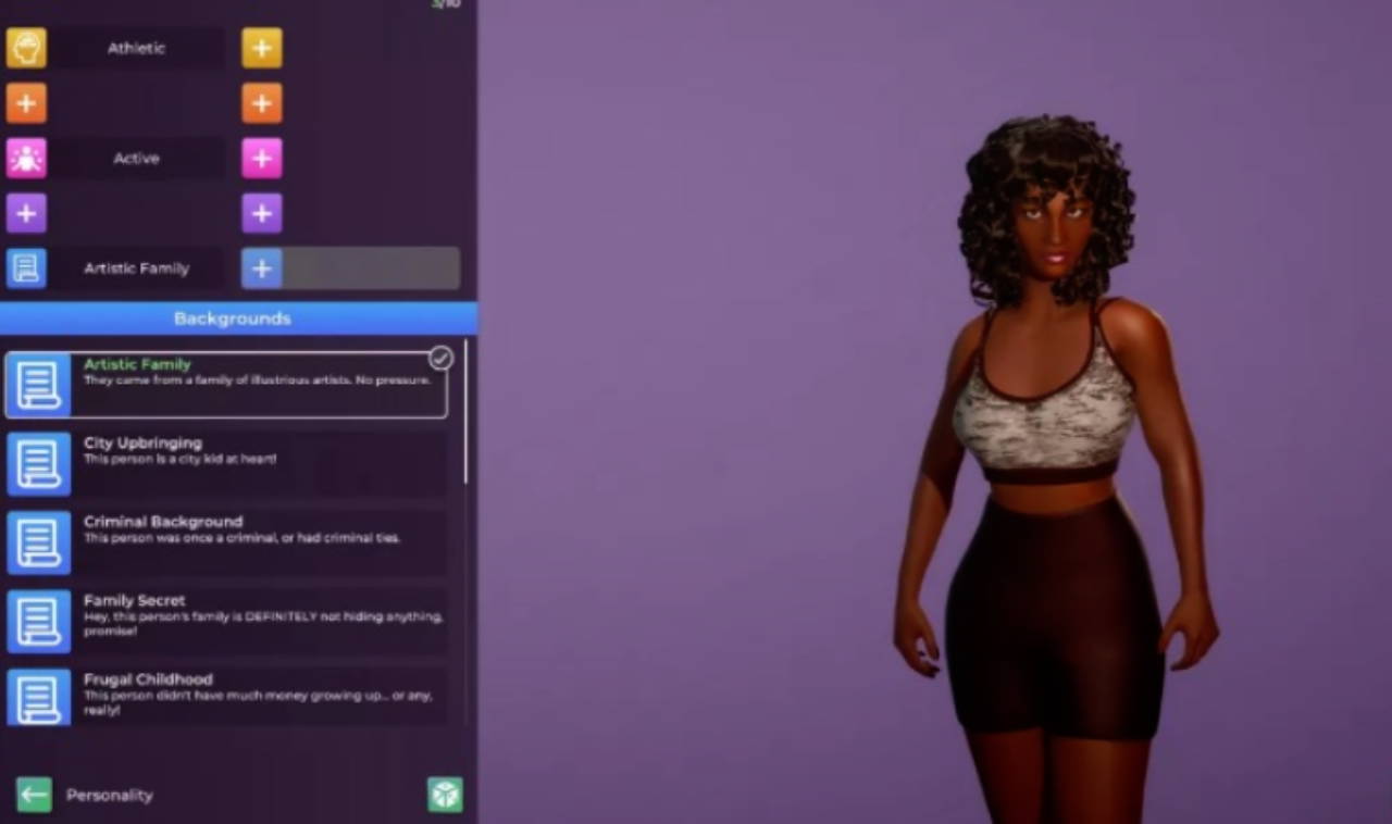 Yaşlarını ve yaşam evrelerini belirlemenin yanı sıra, cinsiyetlerini (ikili olmayan bir seçenek de dahil) ve vücut şekillerini de seçebileceksiniz. Bunlara ek olarak, insanlarınızın kişilik ve karakter özelliklerini de seçebilir ve hikayelerini şekillendirmeye yardımcı olacak bir arka plan hikayesi de belirleyebilirsiniz.
