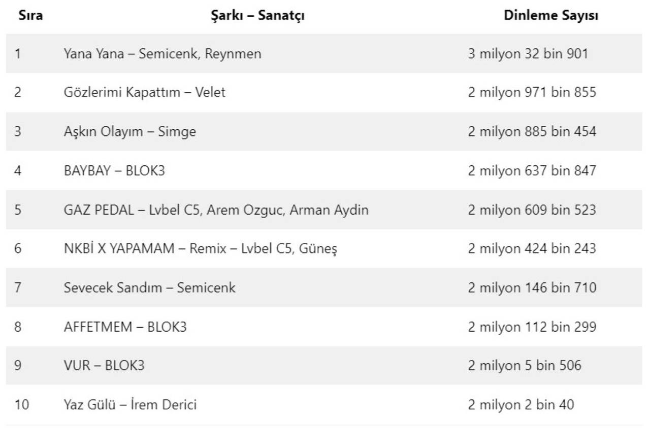 Shift Delete'nin haberine göre Spotify tarafından paylaşılan verilere göre Türkiye’de en popüler şarkı, Reynmen ve Semicenk’e ait “Yana Yana” parçası oldu. Parça, 3 milyondan fazla dinlendi. Öte yandan hemen ardından ise onu Velet tarafından söylenen “Gözlerimi Kapattım” takip etti.