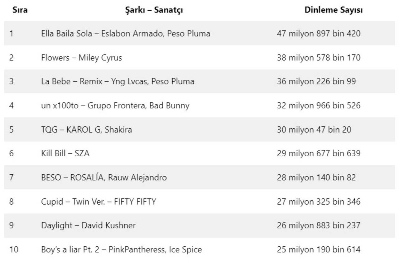Spotify, Türkiye bir yana dünya genelindeki en popüler parçaları da açıkladı. Buna göre en çok dinlenen global şarkı, “Ella Baila Sola” oldu. Eslabon Armado ve Peso Pluma tarafından yayımlanan parça, toplamda neredeyse 48 milyon kez dinlendi.