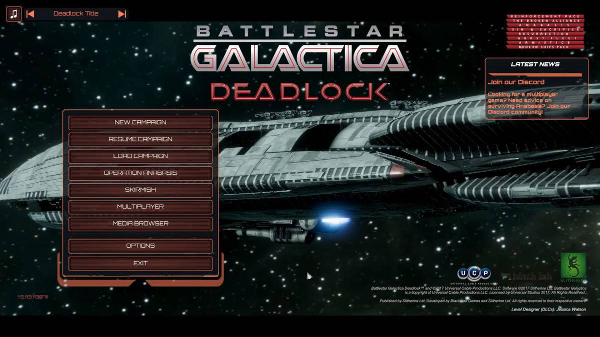 Battlestar Galactica: Deadlock isimli oyun dizinin 2004 yılında yayınlanan sezonu ve 2003 yılında yayınlanan mini dizisini konu alıyor. Oyun isminden de anlaşılacağı üzere uzayda geçiyor. Kendi filonuzu kurarak çeşitli maceralara atılıyorsunuz. Oyunda Battlestar Galactica evreninde geçen Birinci Saylon savaşına da katılabiliyorsunuz.