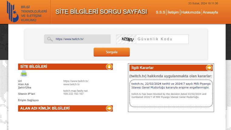 sitesindeki 'Site Bilgileri Sorgu Sayfası'nda yapılan sorgulamada, Twitch'in 22