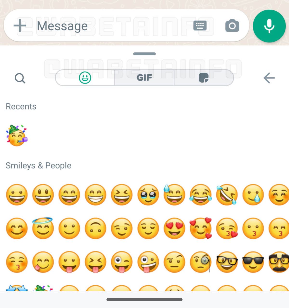 WhatsApp'ın mevcut sürümlerinde, üst kısımda emoji kategorilerini, alt kısımda ise GIF veya çıkartmalar için seçenekler görürüz. Yeni düzende bu görünüm değişecek gibi görünüyor. Klavyenin üst kısmında arama ve diğer seçenekler, alt kısımda ise emojiler yer alacak. Emoji kategorileri alt kısma taşınabilir veya tamamen kaldırılabilir gibi görünüyor.