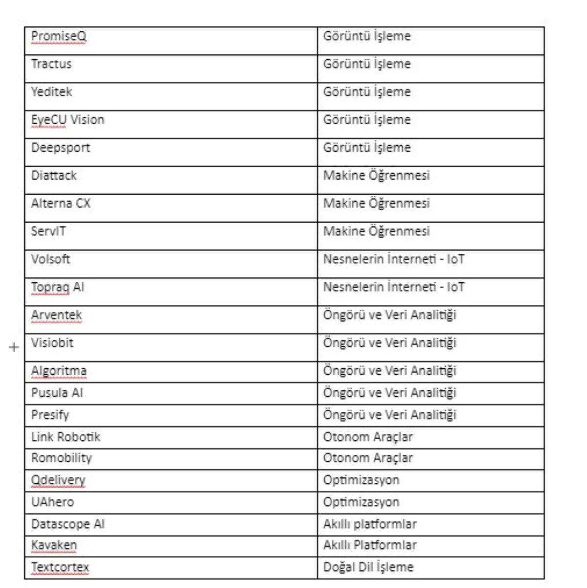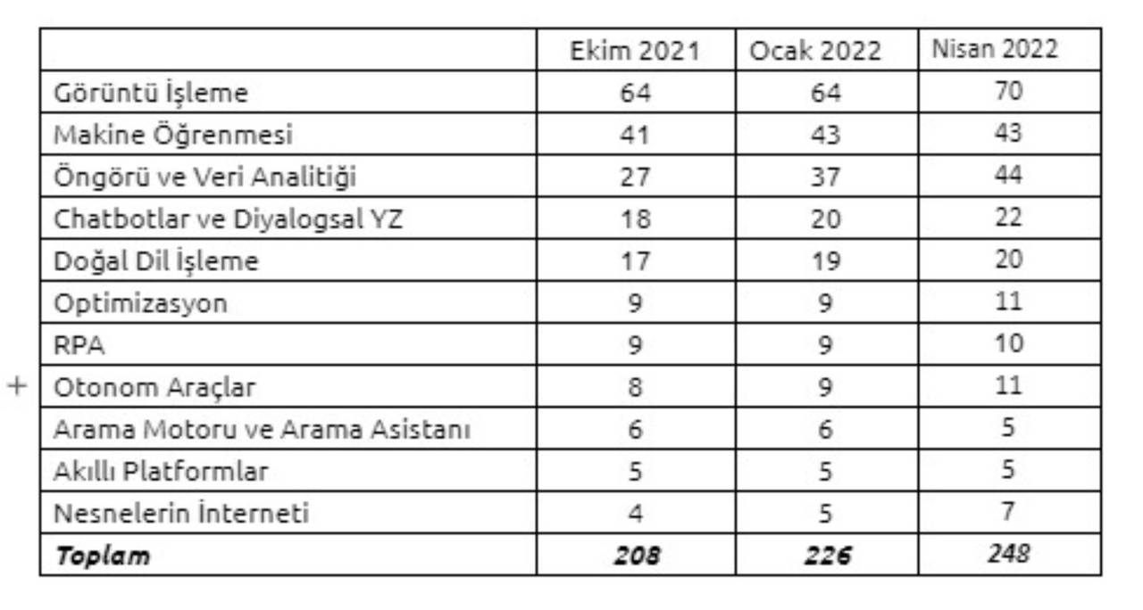 Türkiye Yapay Zeka İnisiyatifi’nin (TRAI) yeni yayınlanan Yapay Zeka Girişimleri Haritası’nda görüntü işleme, öngörü ve veri analitiği, arama asistanı ve arama motoru, doğal dil işleme, chatbot- diyalogsal yapay zeka, makine öğrenmesi, optimizasyon, otonom araçlar, robotik süreç otomasyonu (RPA) ve akıllı platformlar ile nesnelerin interneti alanlarında çalışmalar yapan 248 girişim yer aldı. (https://turkiye.ai/girisimler/ )