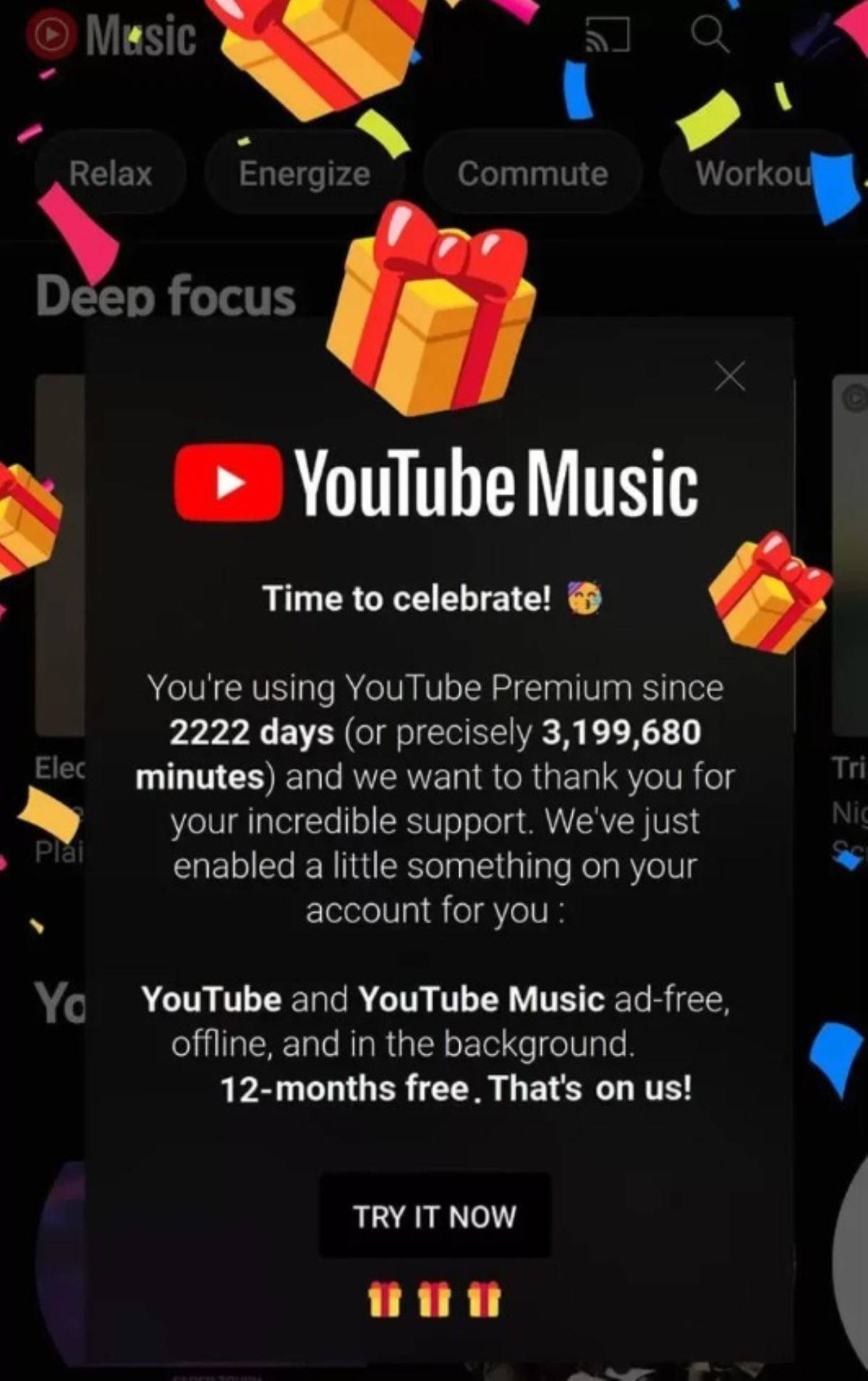 Bir kullanıcı, YouTube Premium’a 2 bin 222 gün (3.199.680 dakika) abone olmasının ardından Android için YouTube Music’te bir ‘Kutlama Zamanı’ istemi aldığını belirtti. Bu istem, 6 yıl 1 aydan fazla zaman içerisinde belirdi. Kullanıcının belirttiğine göre, ekranda hediyeler ve konfeti yağmuruyla tamamlanan bir görüntü ortaya çıkıyor.
