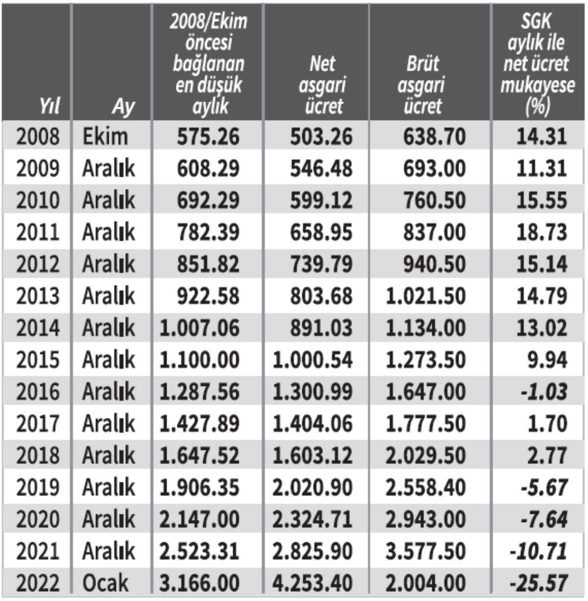 Buna göre, 2008/Ekim-2022/Ocak süresinde belirlenen asgari ücretin net tutarları ile 2008/Ekim öncesi bağlanan ve bu sürelerde ödenen en düşük emekli aylıkları aşağıdaki tabloda karşılaştırılmış ve fark tutarları oransal olarak gösterilmiştir.