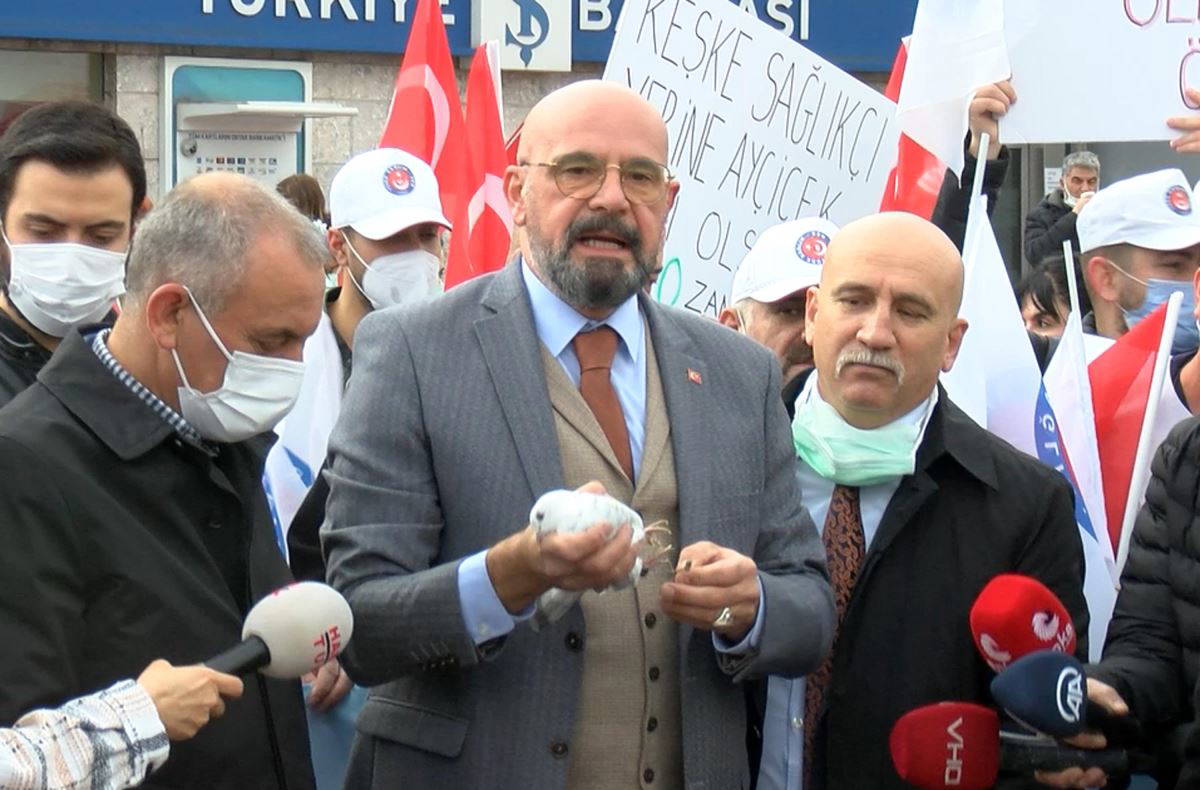 Ankara'da Türkiye Kumu-Sen'e bağlı Türk Sağlık-Sen üyesi sağlık çalışanları, taleplerini güvercin uçurarak iletti.