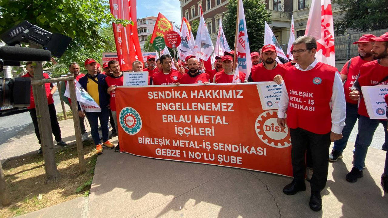 Sendikalı oldukları için tazminatsız şekilde işten atılan Erlau Metal işçileri, Alman şirketi protesto için Almanya Başkonsolusluğu önünde ses yükseltti. Şirketin iktidardan cesaret aldığını söyleyen Birleşik Metal İş Sendikası Başkanı Özkan Atar, "Ülkede düzen böyle olusa Alman patron da gelir sizin işçinizi köle yerine koyar" dedi.